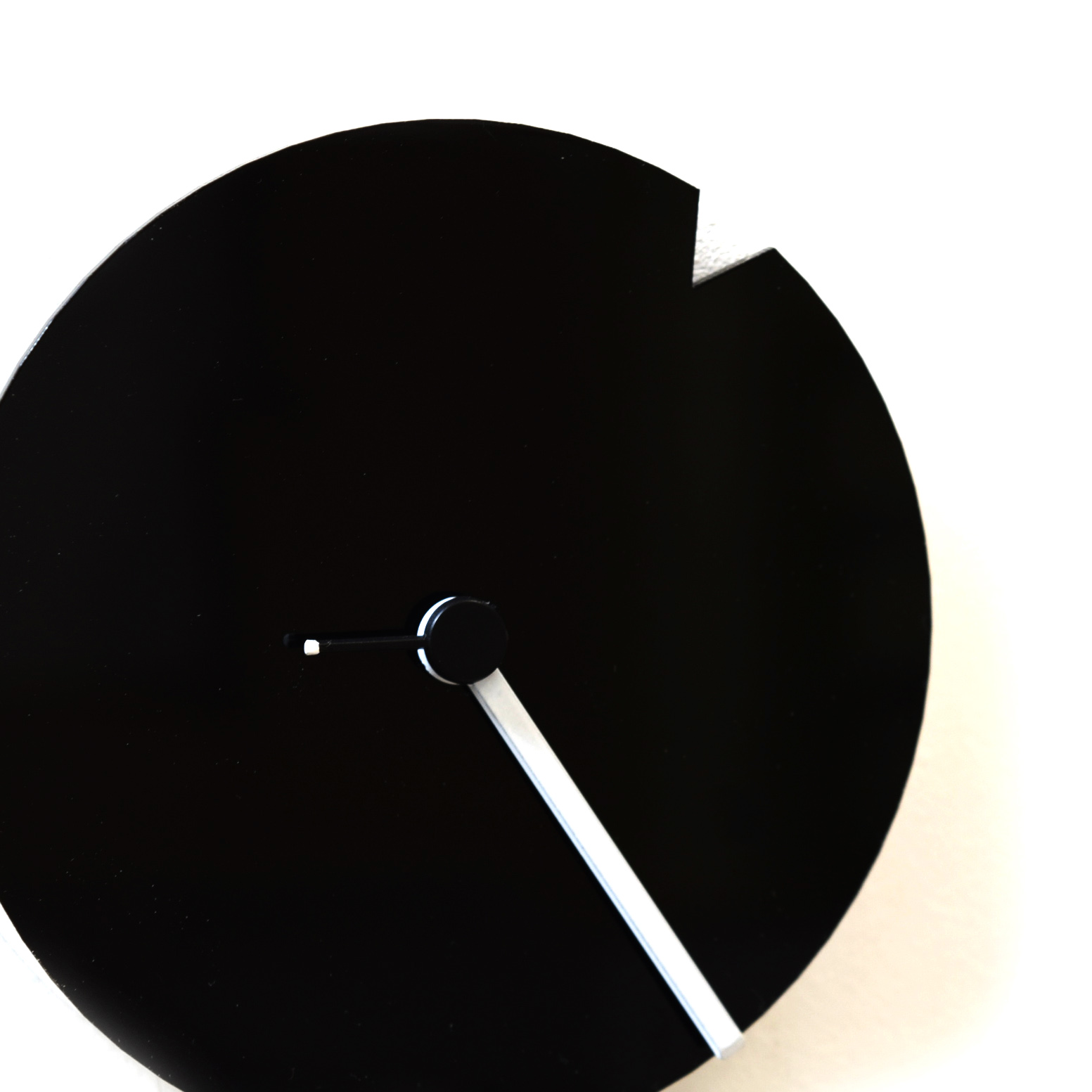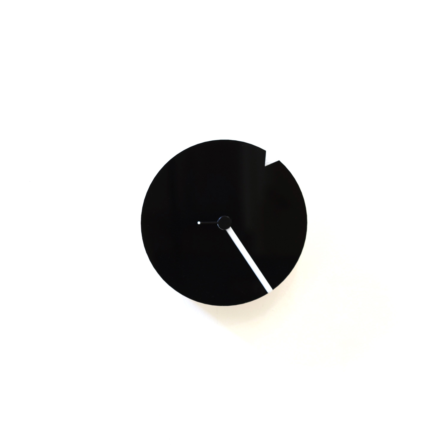 This clock is the minimalism itself. The black acrylic dial of this clock is the hour hand herself that rotates around slowly while showing the time with that triangular indent on the rim. The minute hand is a regular white rod while the second hand is a short black pin with a white point on its tip - and is only visible when seen from closer distance.