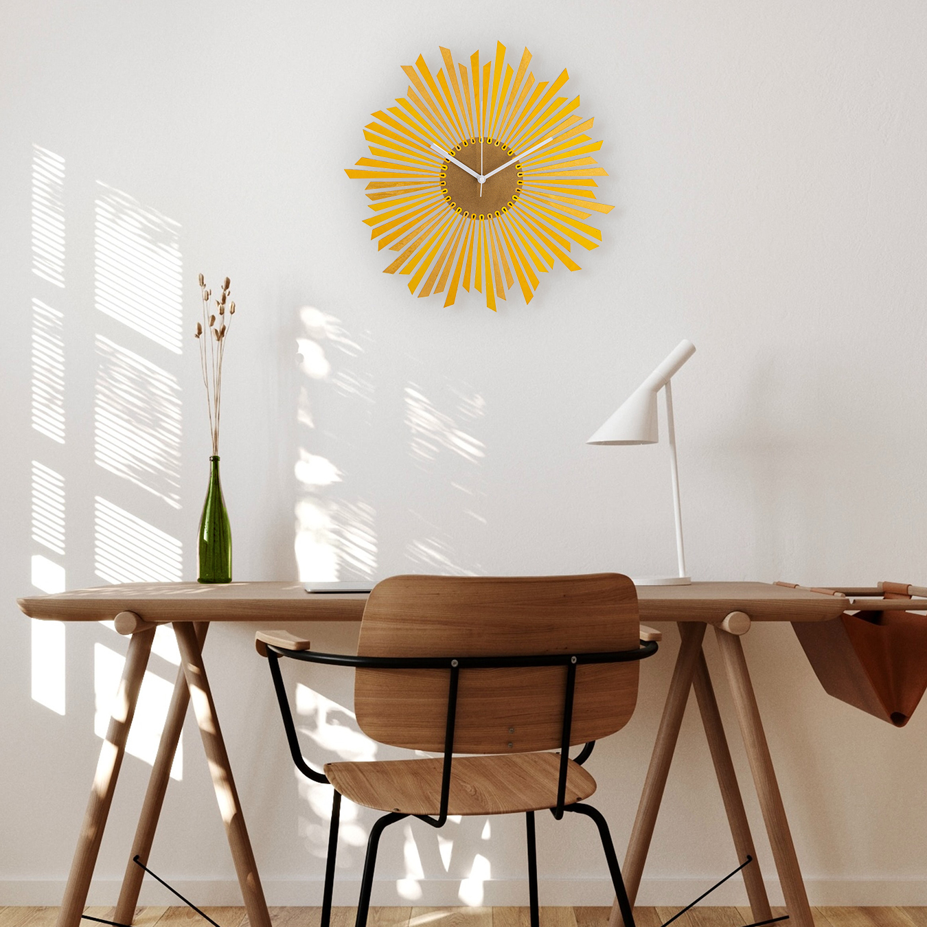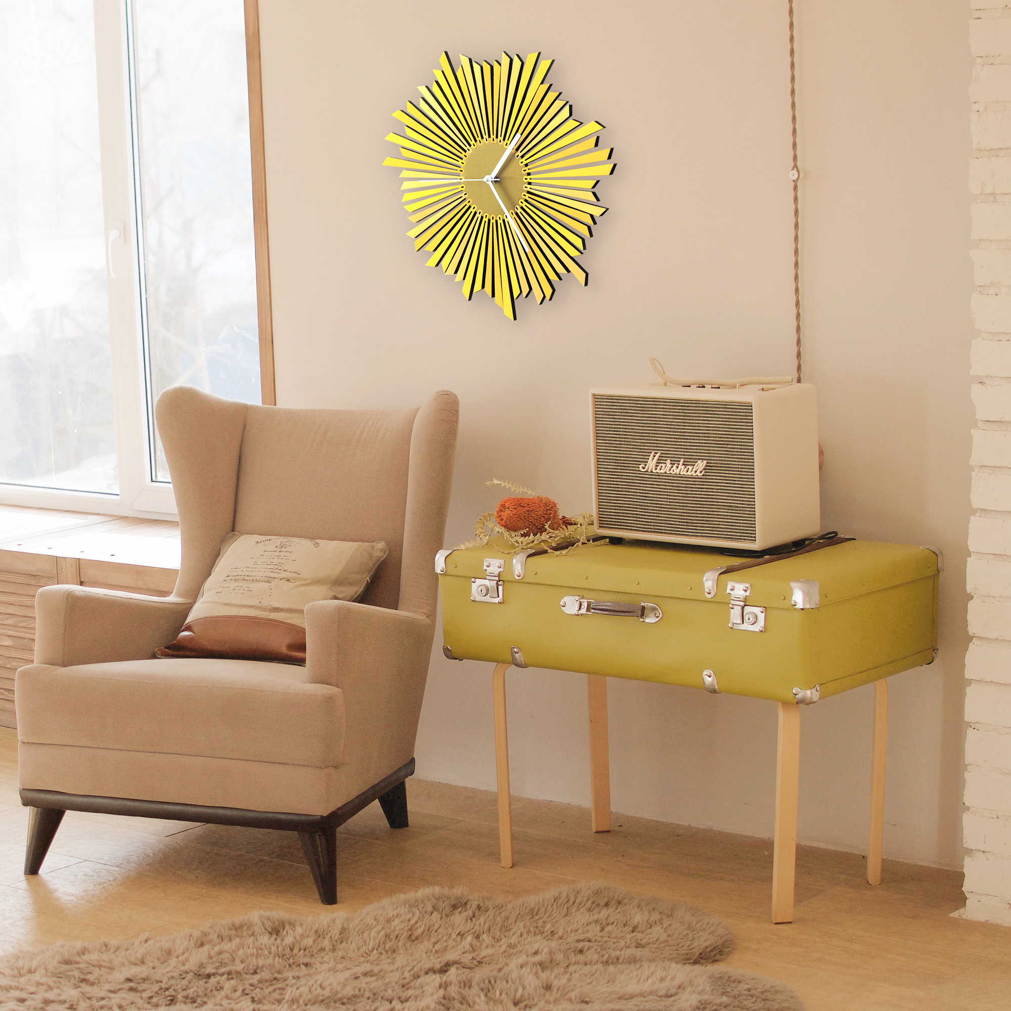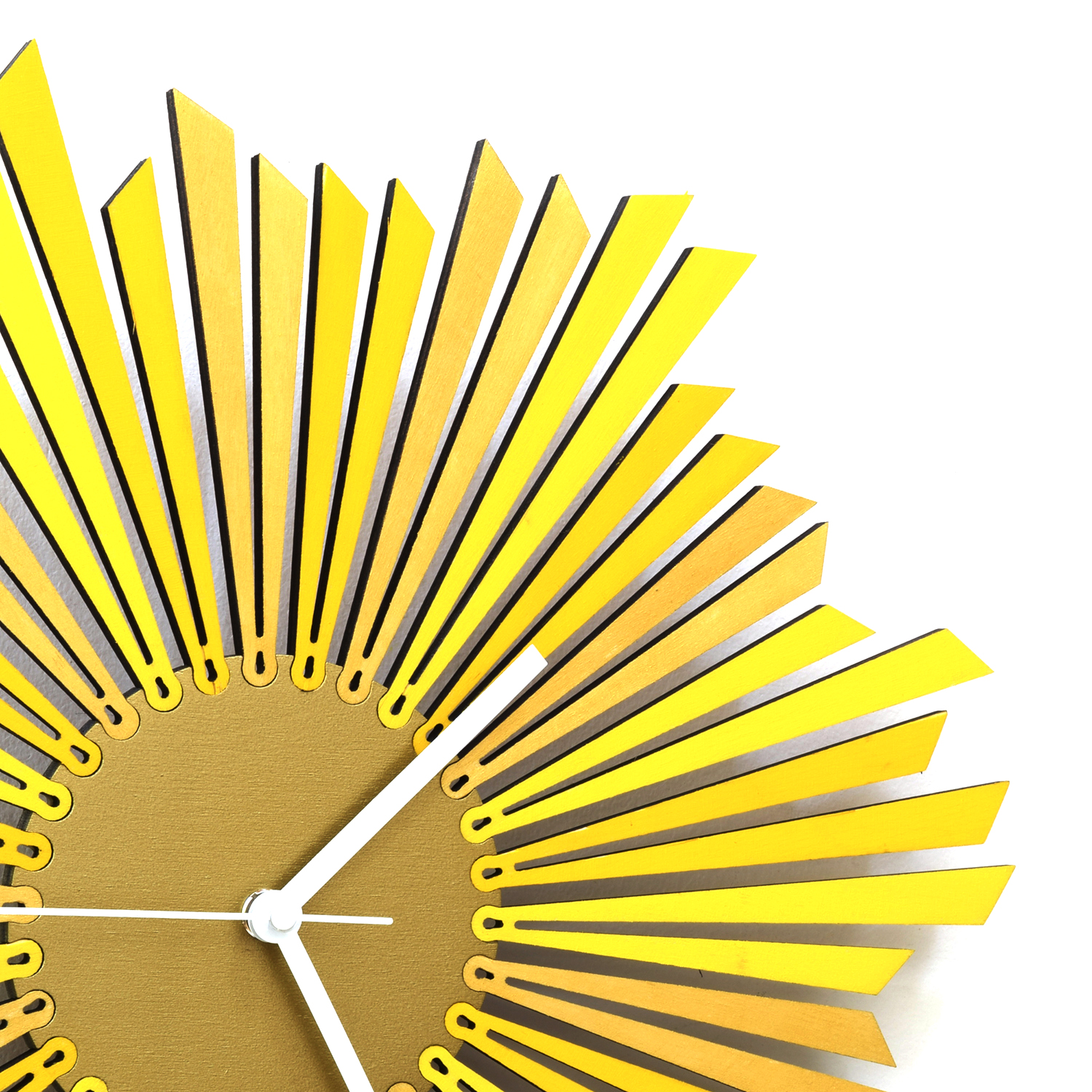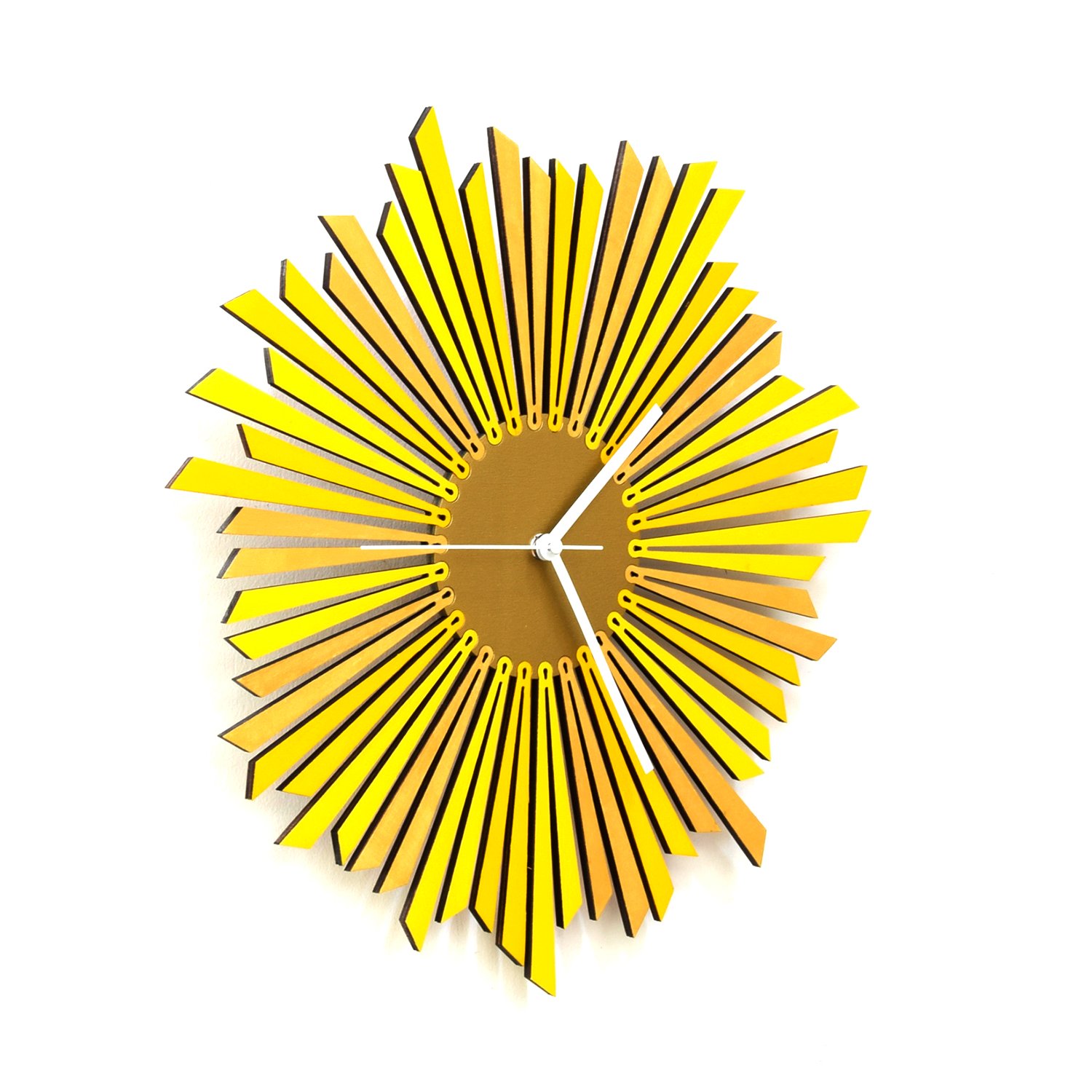 The Sun - stylish organic yellow / golden wooden wall clock, a piece of wall art