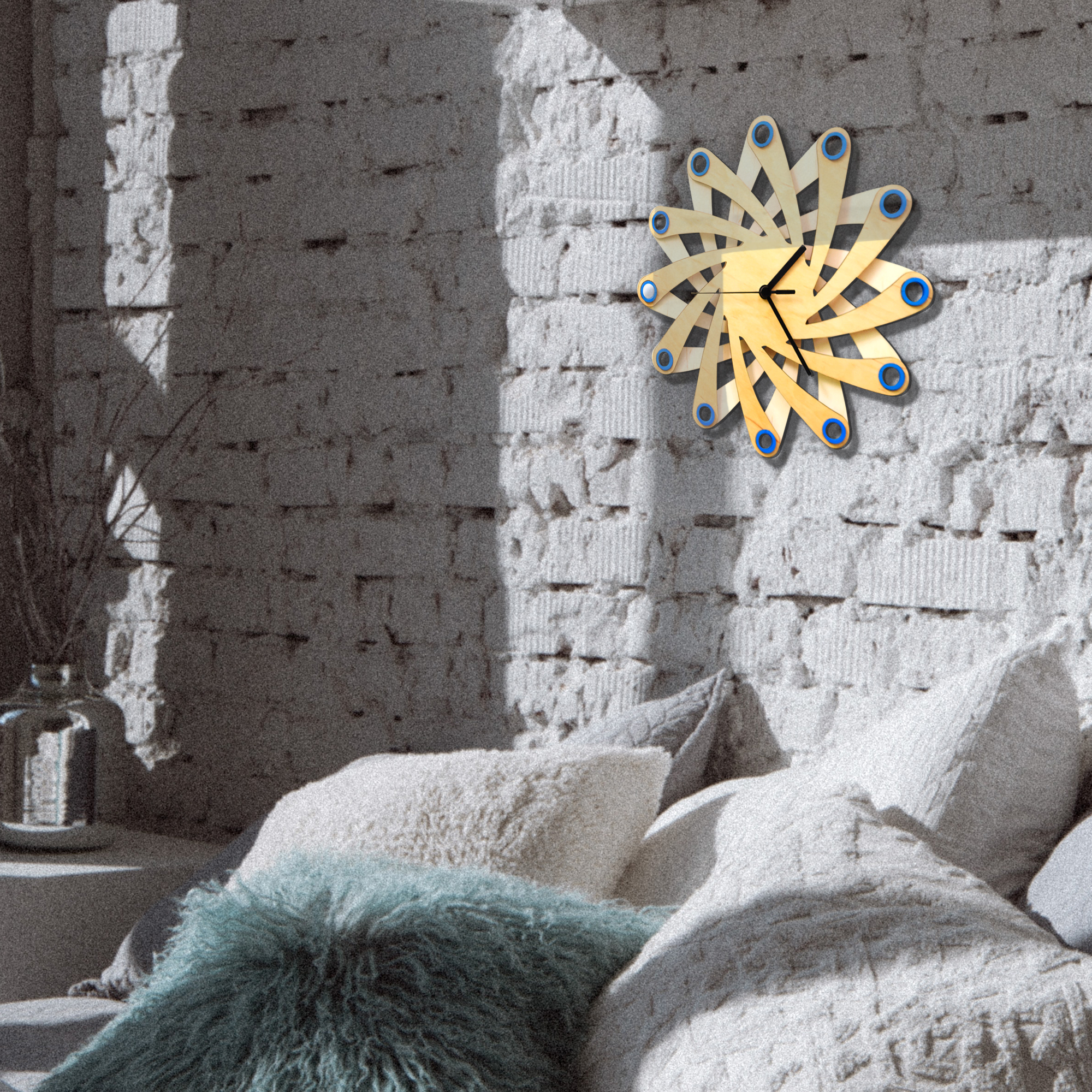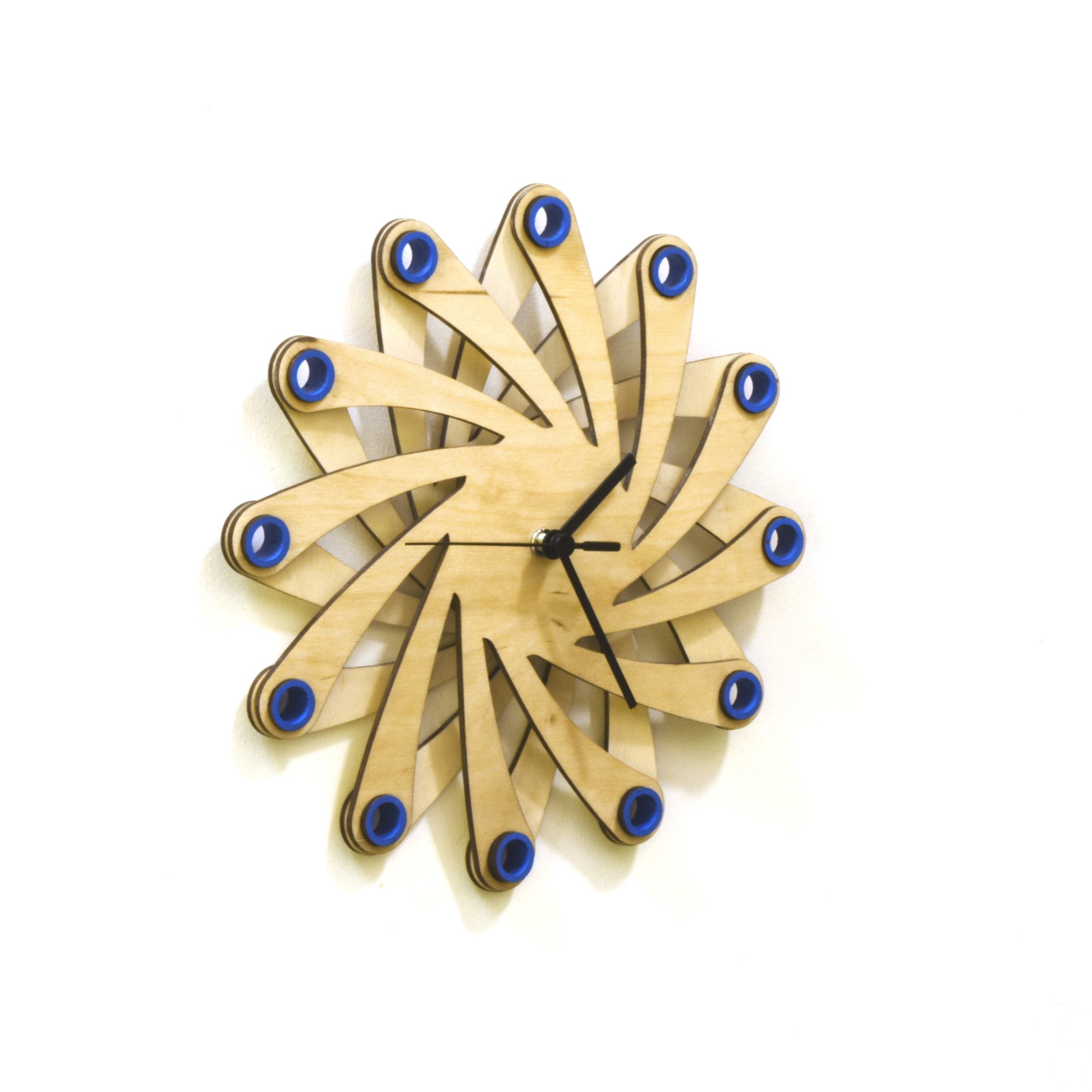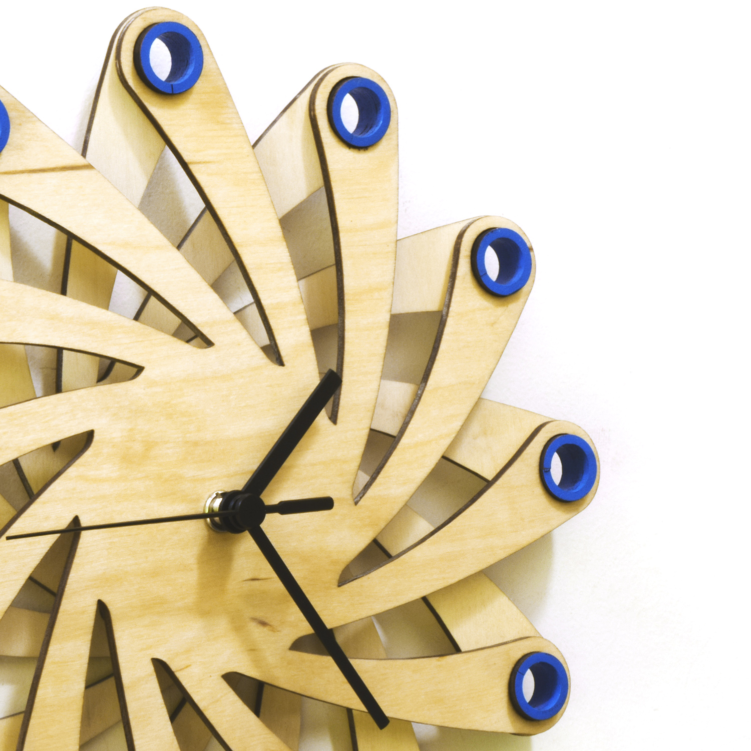 - Manufacturing process: the dial of this particular clock is laser cut from 2 layers of 4mm birch plywood board, the finishing (polishing) is made by hand. The 12 small rings around the perimeter are painted blue, while the surface is oiled with flax. No glue is used while assembling the elements.