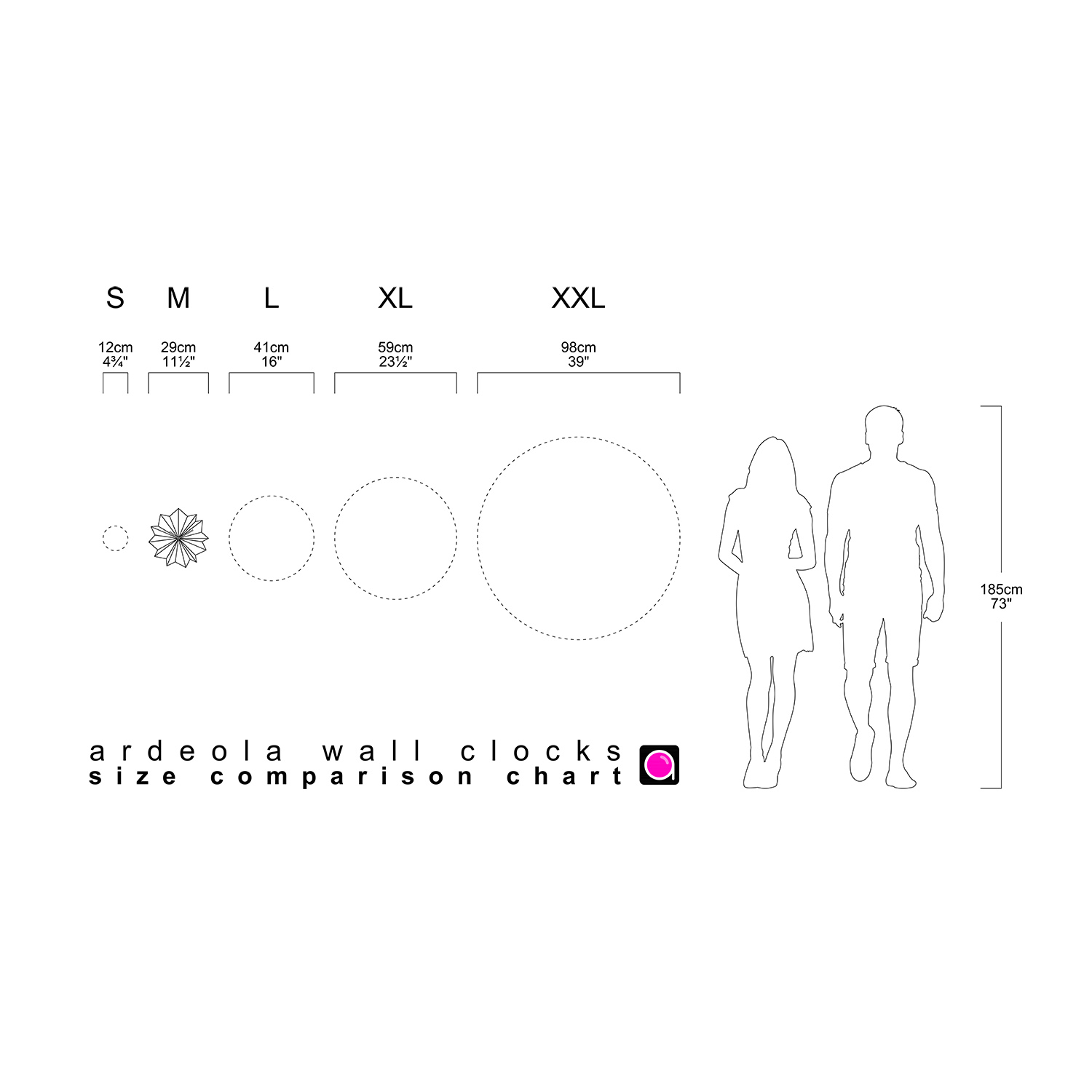- Manufacturing process: the elements of the dial are laser cut from a 4mm birch plywood board, and painted with 2 shades of green. The painted pieces are glued on the backplate in alternating order. As these pieces are distributed manually around the disk there are no identical clocks manufactured.