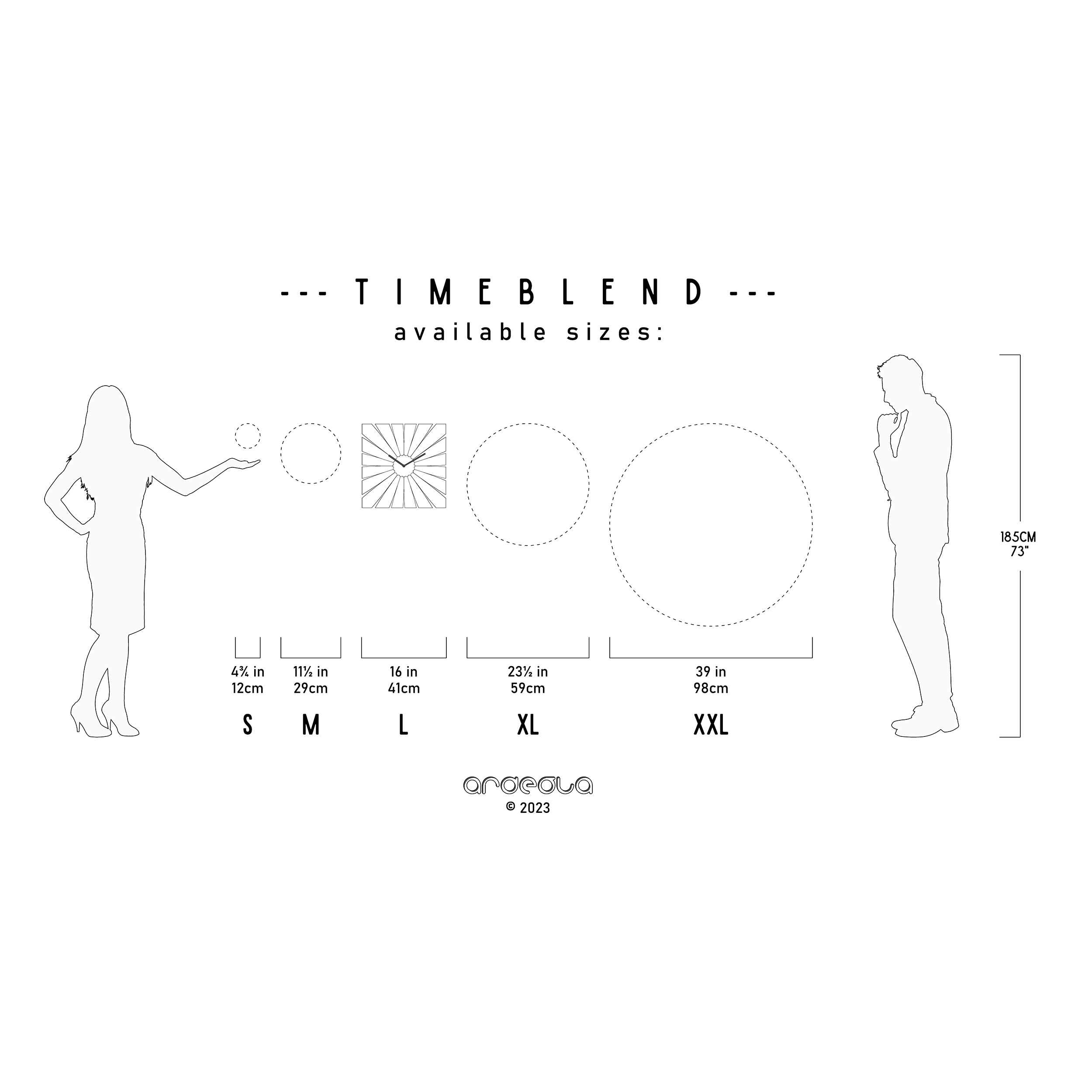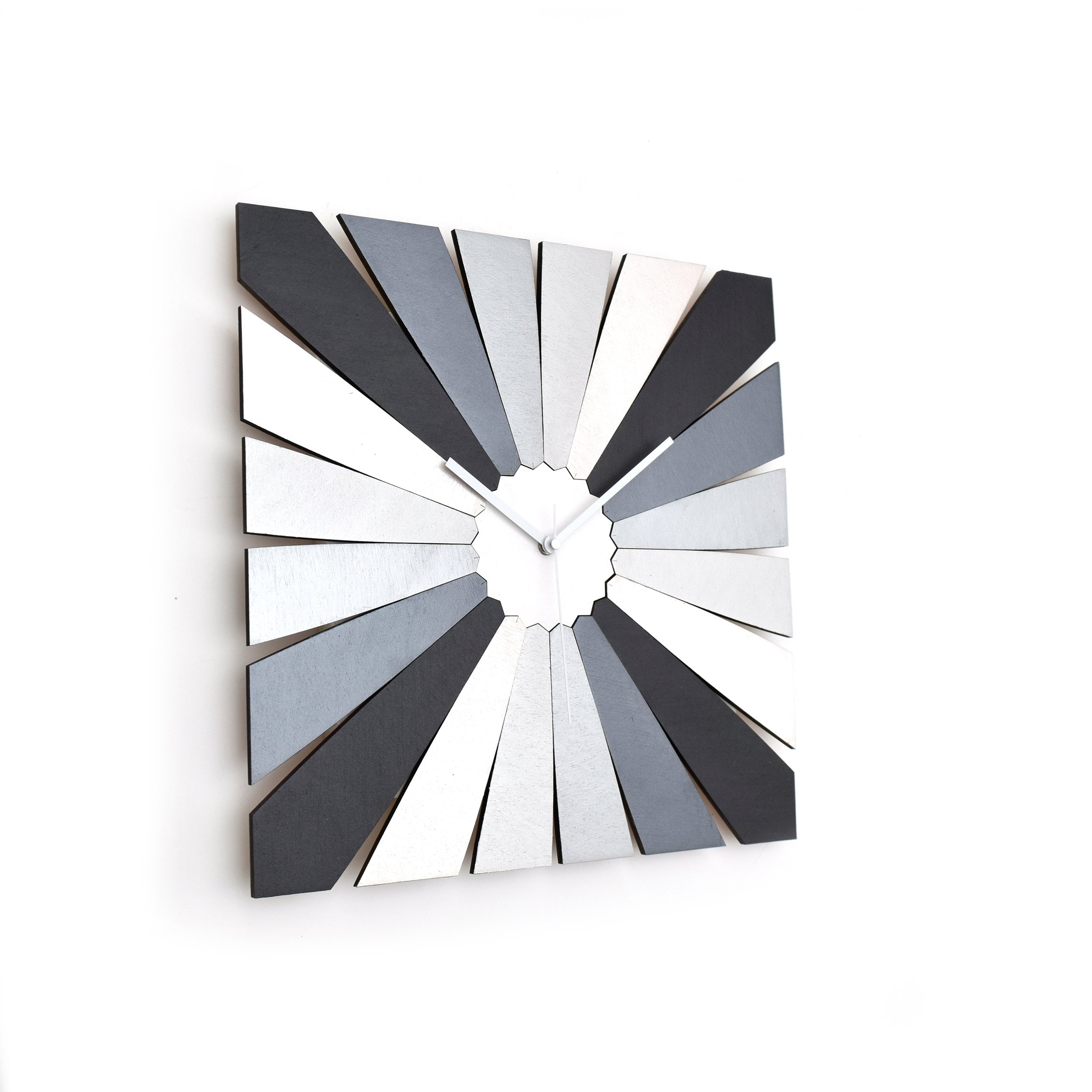 This iconic starburst wall clock is entirely handcrafted in Europe. The 20 wood pieces that make up the quadratic Sun form are hand-painted with 5 different shades of acrylic silver.