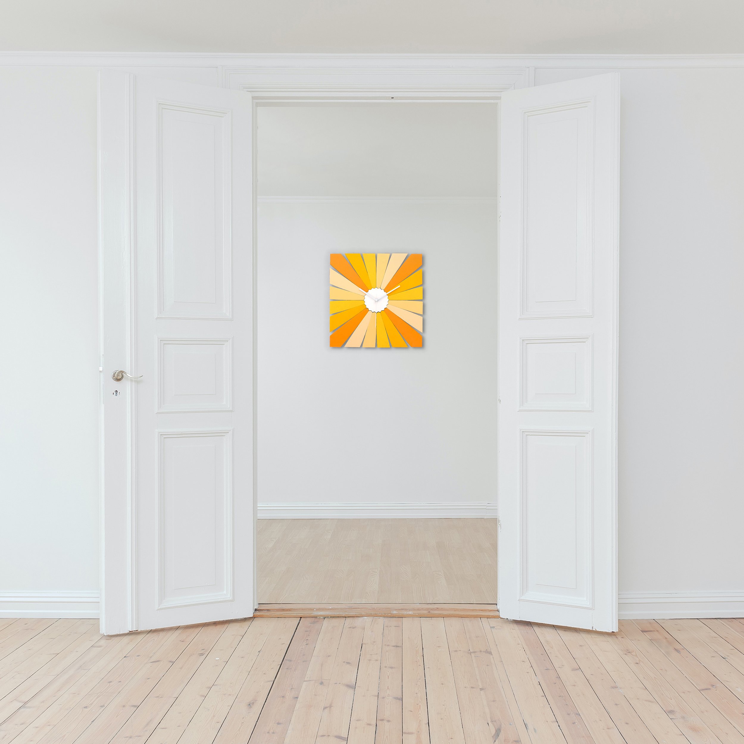 Timeblend Yellow is a rectangular wall clock with a radial pattern. The 'rays' are hand painted with five gradient shades of yellow. This wooden wall clock also symbolizes the Sun.