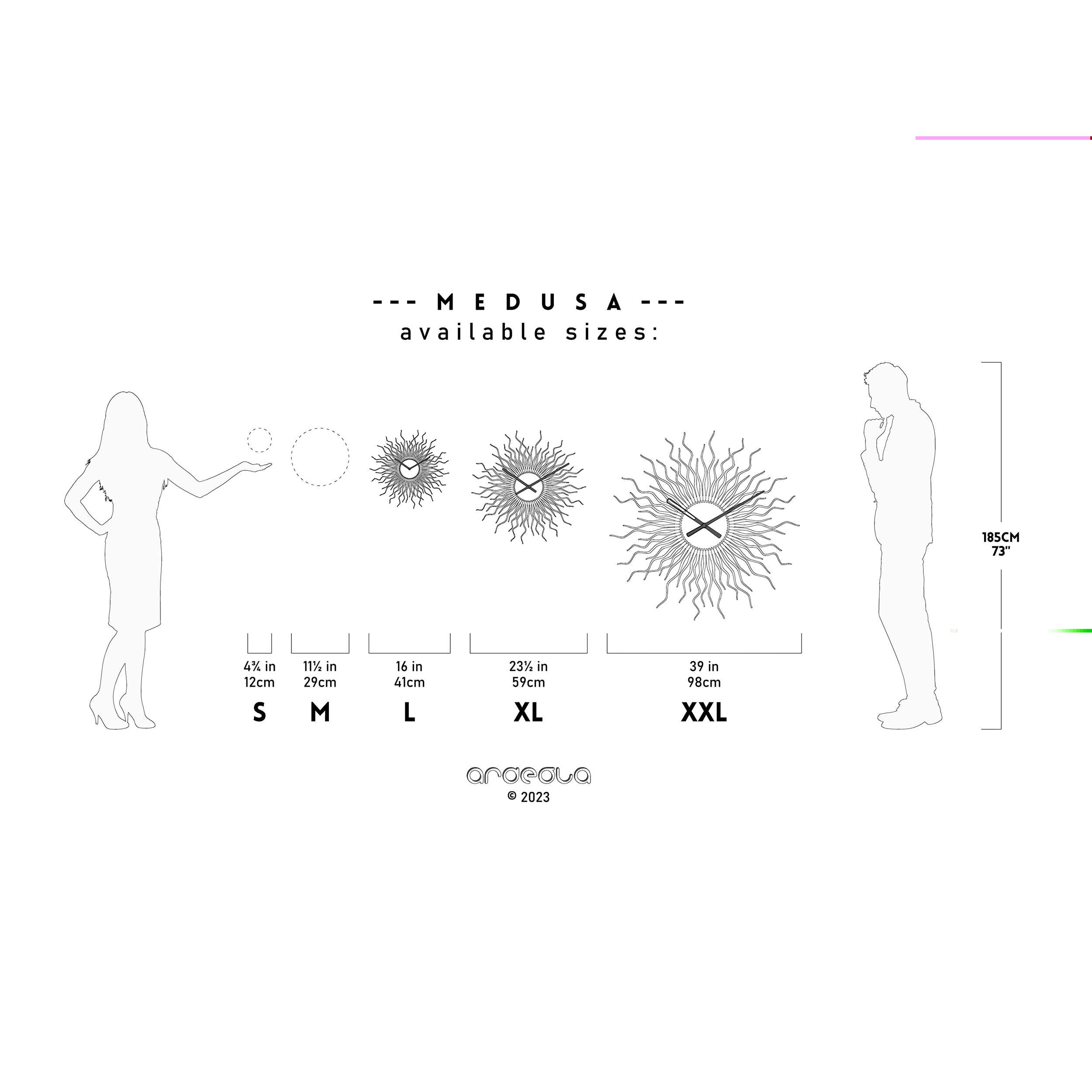 The laser cut and hand-painted clock is available in three sizes: large (L) 41cm / 16 in, extra large (XL) 59 cm / 23.5 in, and oversized XXL 98 cm / 39 in. See the text below for more information, or check out the size chart image.