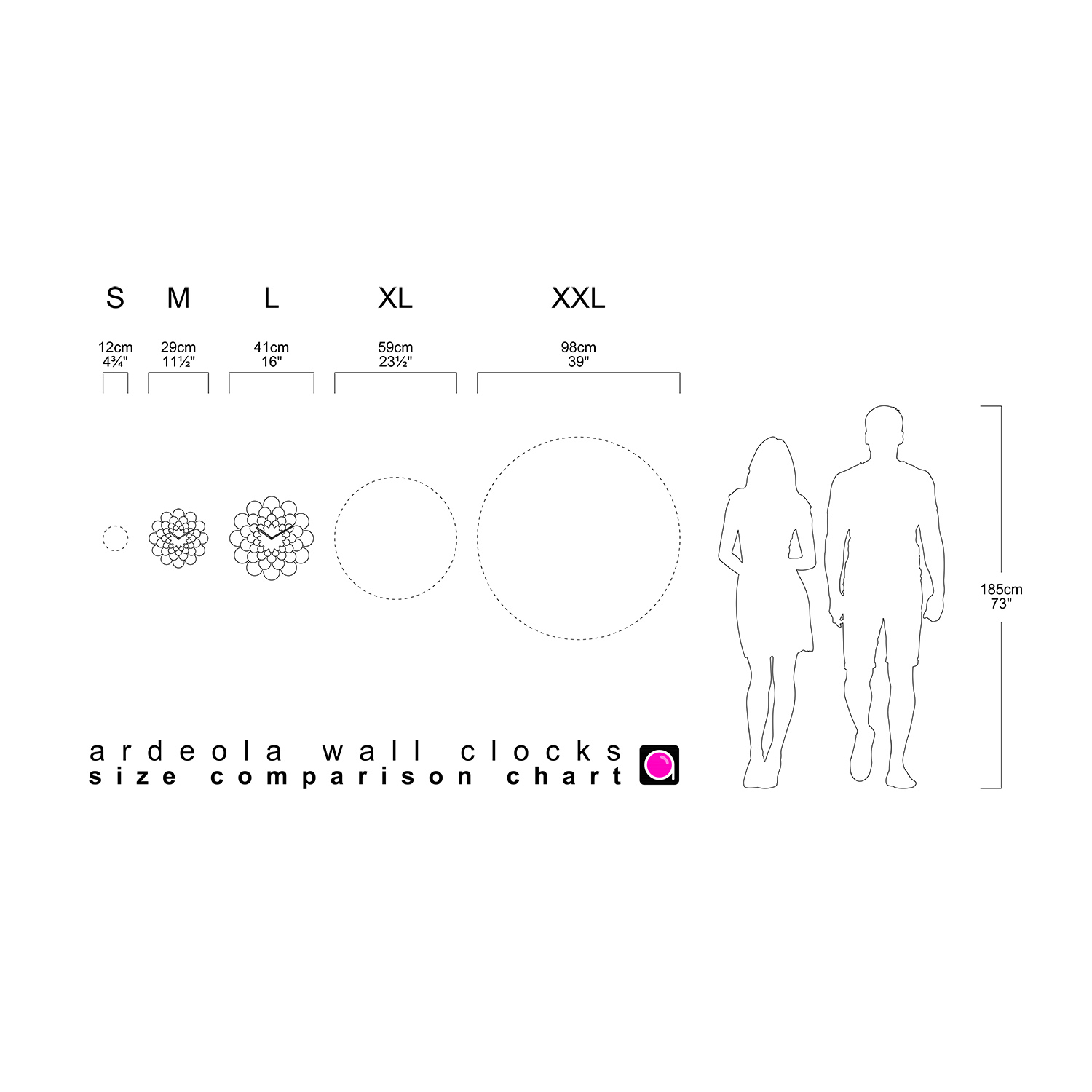 - Hands: plastic (M) / metal (L) in black.